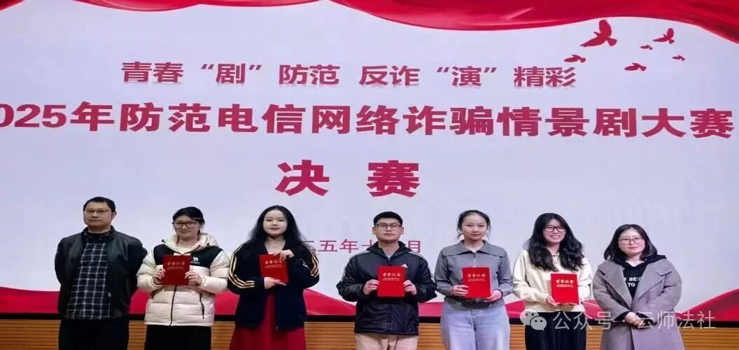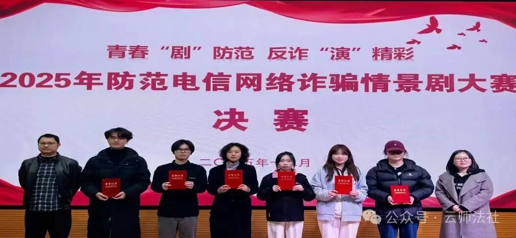 为深入贯彻《反电信网络诈骗法》,提升学生法治观念与安全防范意识,12月13日,2025年“青春‘剧’防范,反诈‘演’精彩”校园防范电信网络诈骗情景剧大赛决赛在明德1号楼301报告厅举行。活动由学生处、校团委、保卫处主办,法学与社会学学院(云南纪检监察学院)及“蒲公英”普法团承办。